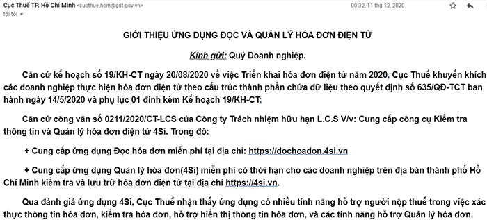 Trong thư điện tử gửi đến toàn thể doanh nghiệp, tổ chức kinh doanh trên địa bàn Thành phố Hồ Chí Minh, Cục thuế có ghi: